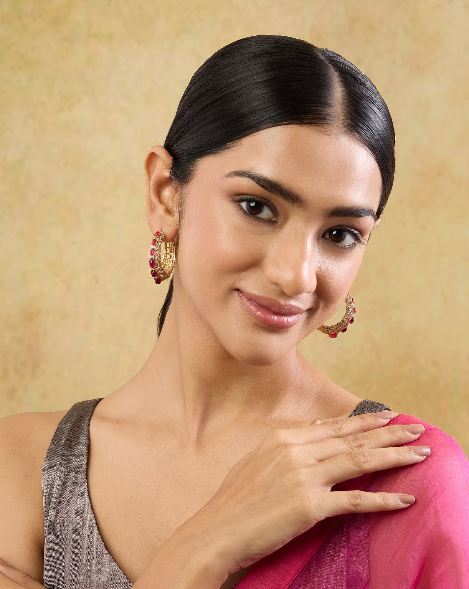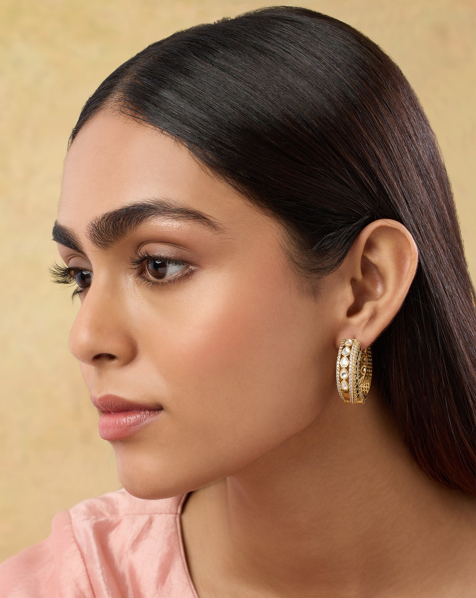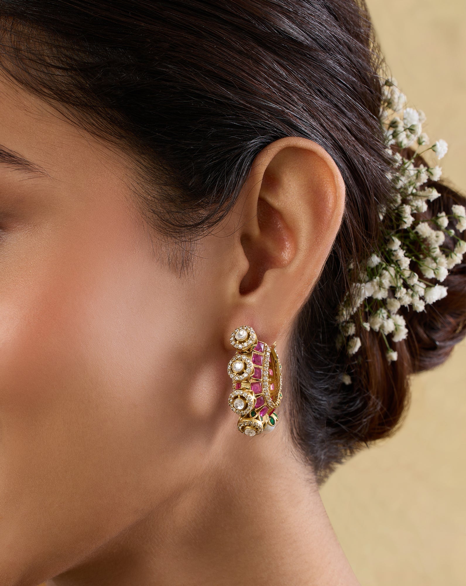 Choose the Right Hairstyle: Hairstyles like a neat bun, side braid, or sleek ponytail are the best bets when it comes to Indian hoop earrings, as they’ll keep your hair away from tangling.