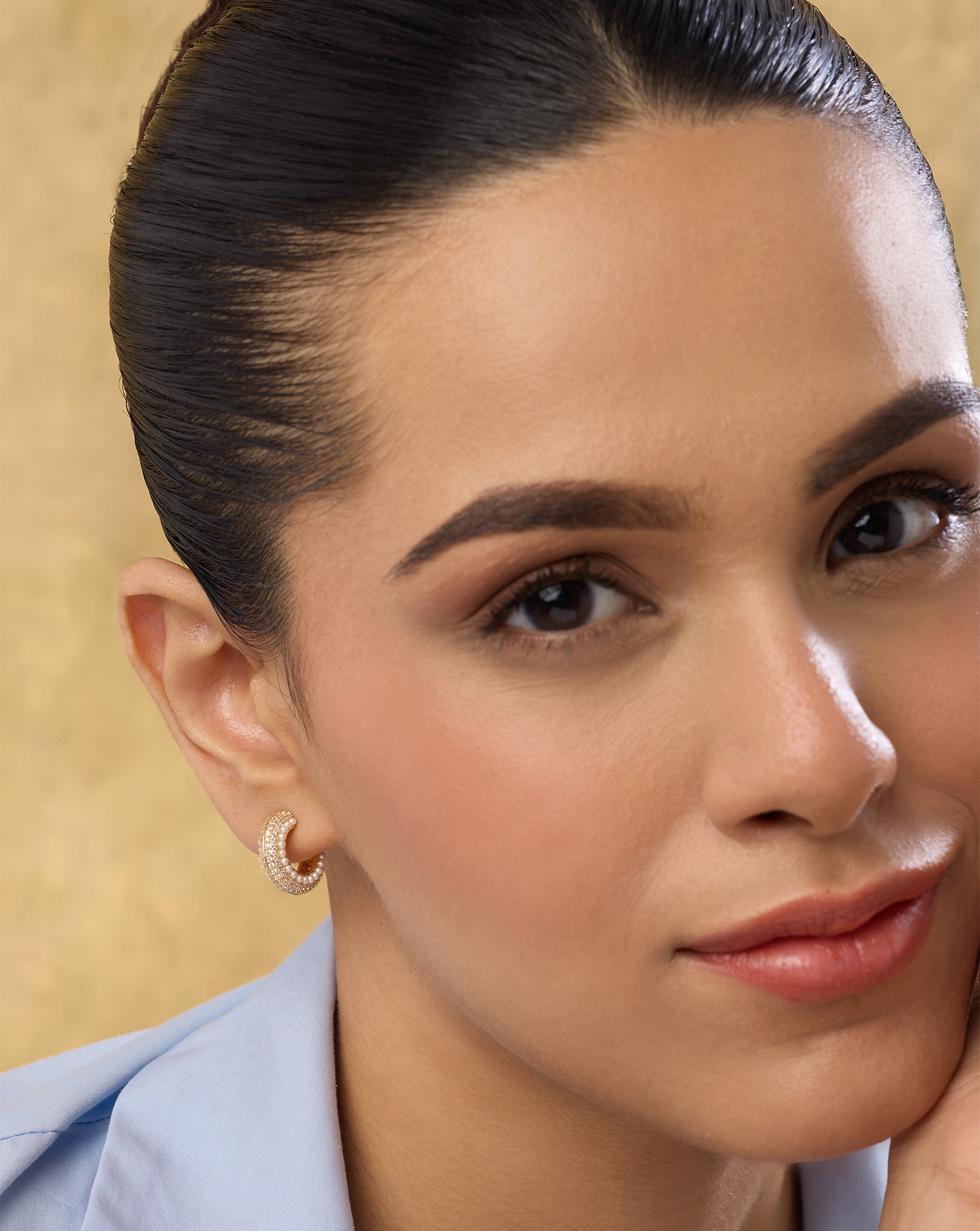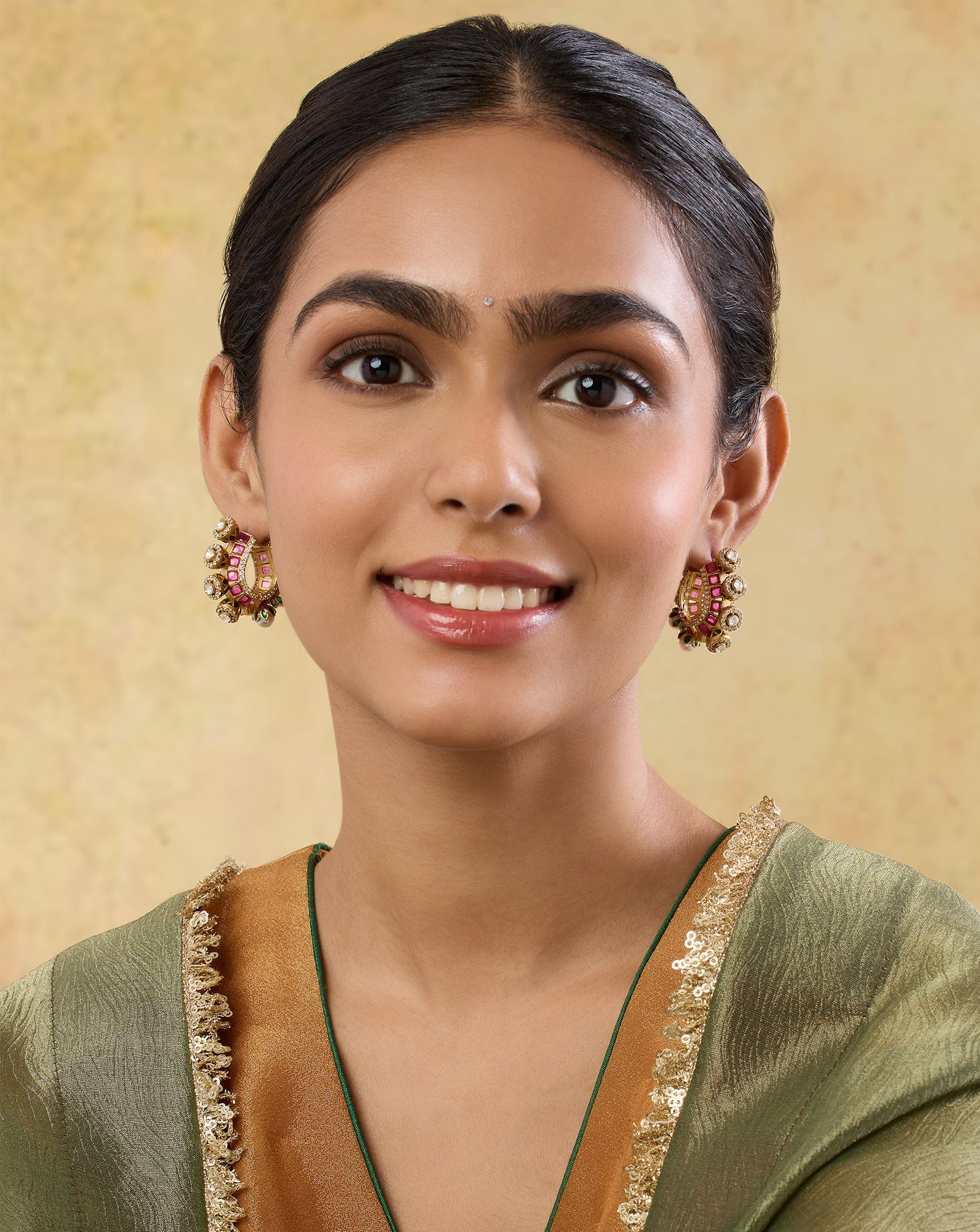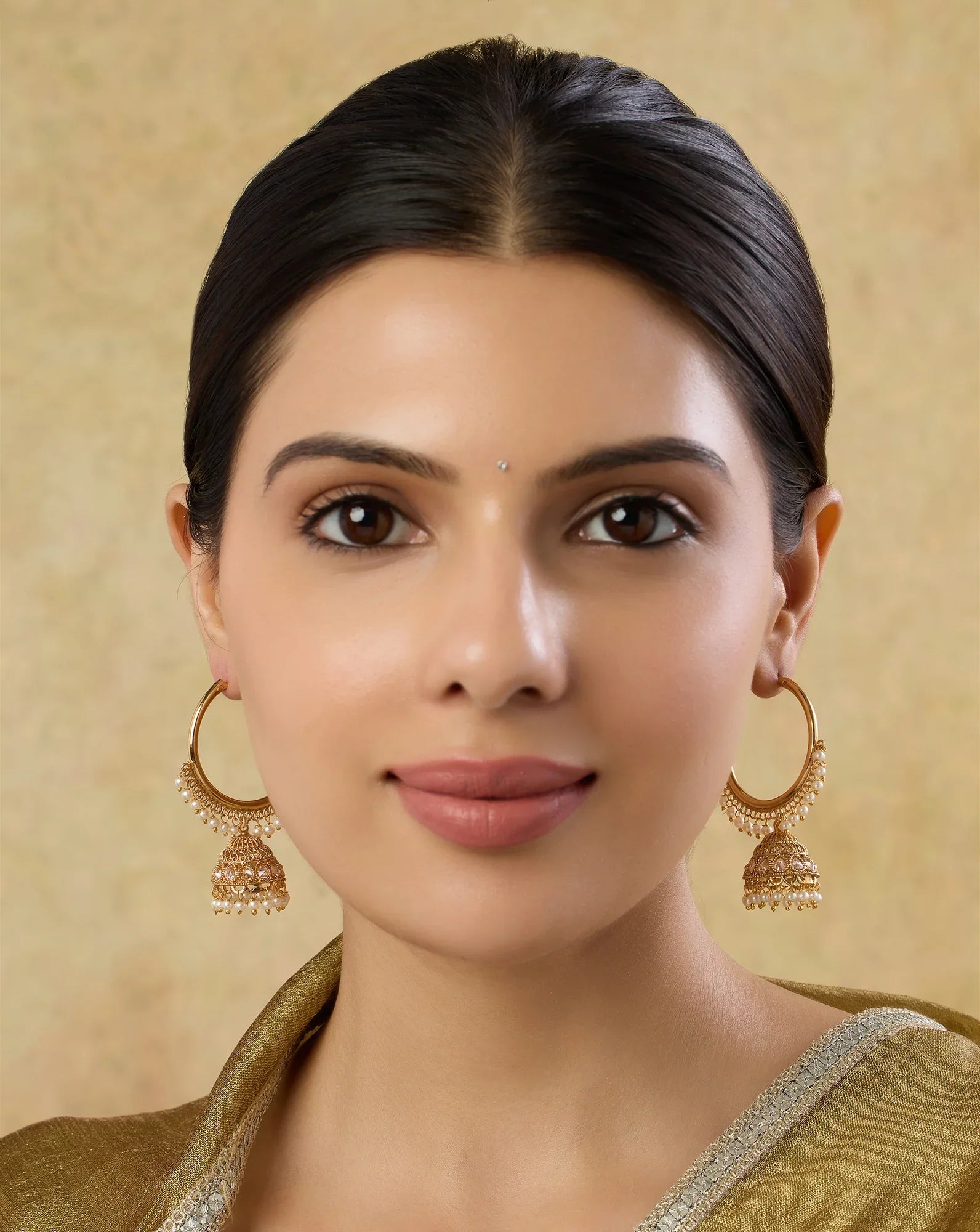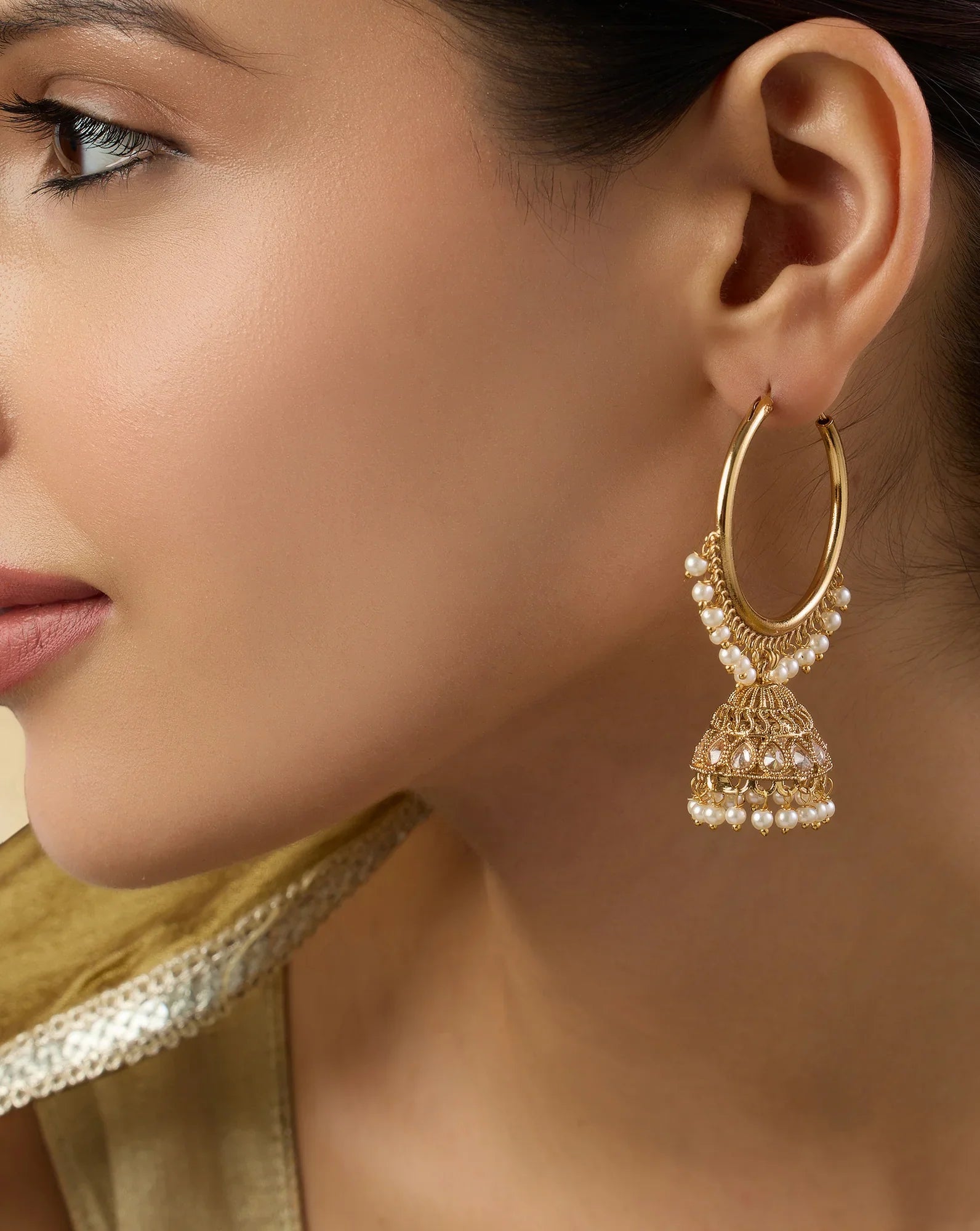 Prioritise Balance: If your hoops are large or heavily embellished with kundan, polki, or meenakari work, avoid heavy necklaces or multiple statement pieces. Let your ethnic hoop earrings do all the talking.