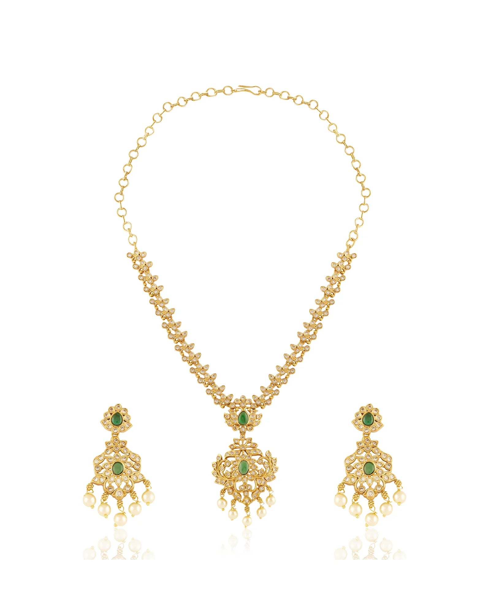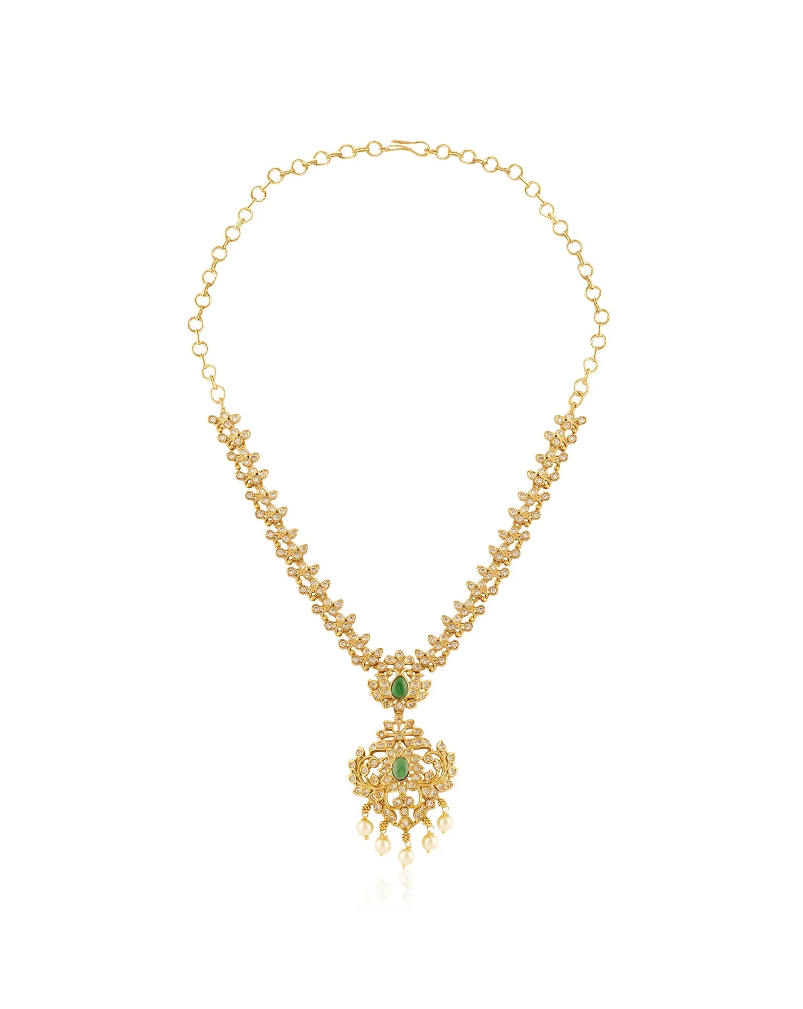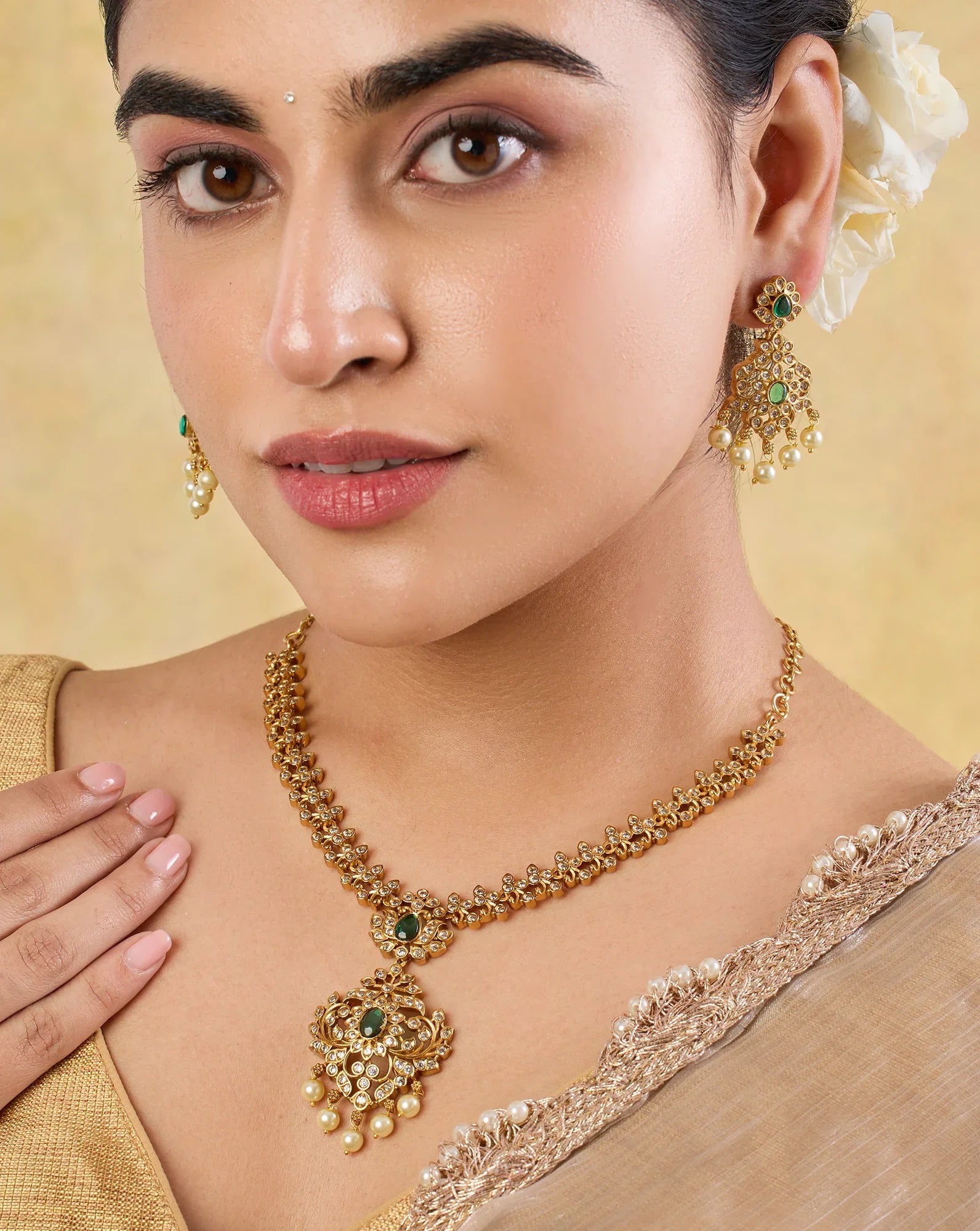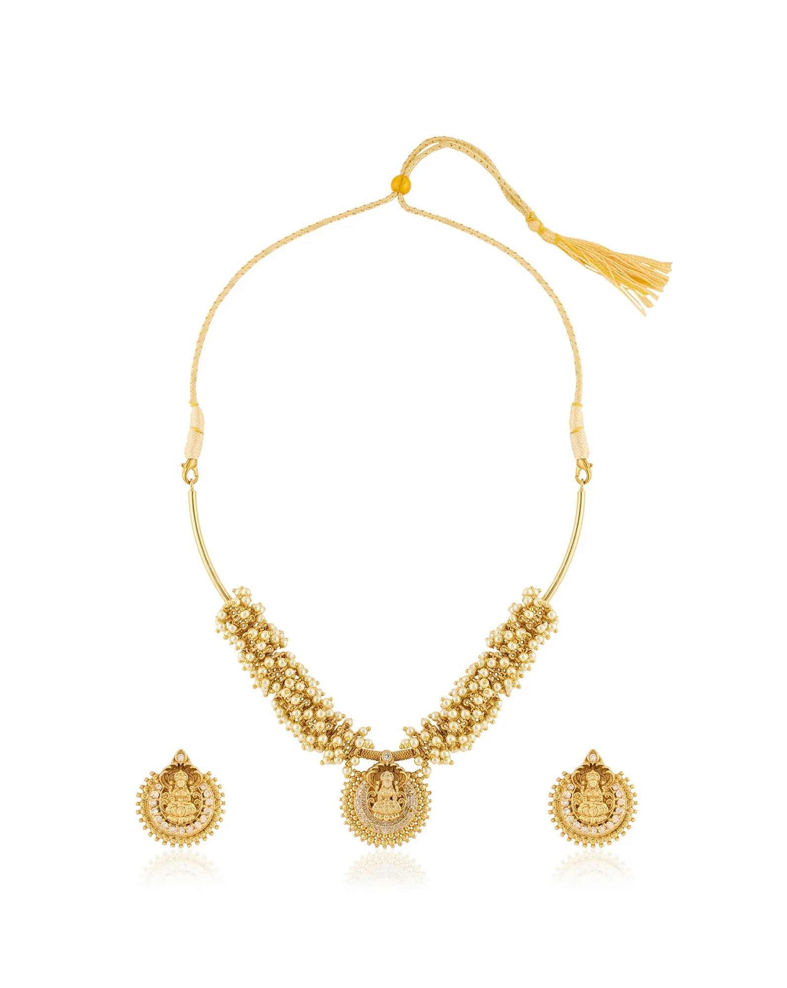 Temple jewellery is one of the richest and oldest jewellery styles in India. Originating in the Chola and Pandya dynasties, it reflects motifs of important deities and temple architecture. This jewellery was an integral part of royal courts and royal weddings in the South of India. Traditionally, temple jewellery was crafted in pure gold by skilled artisans. It was crafted to convey the honour and grandeur of the gods. These jewels have been passed down from generation to generation as family heirlooms.