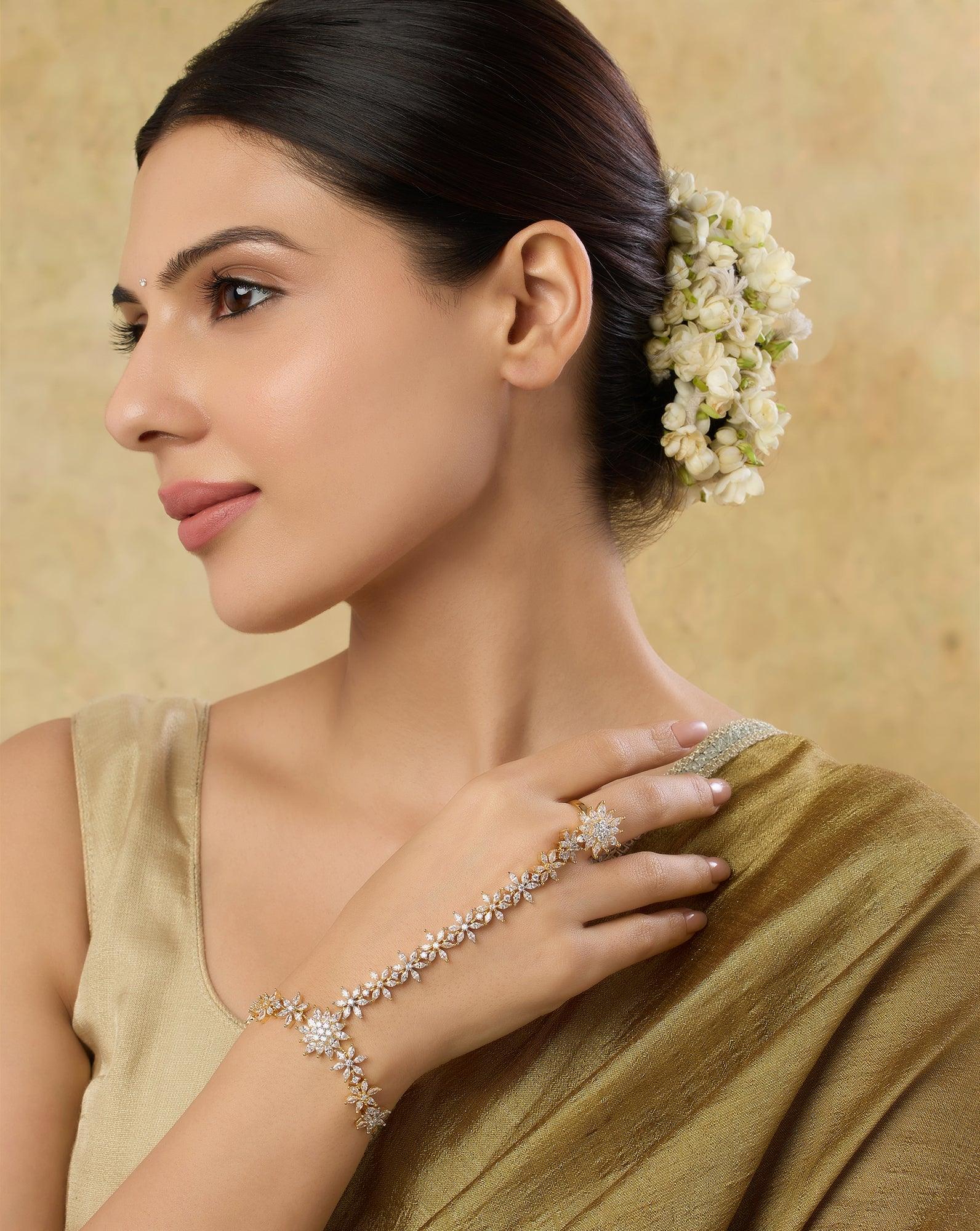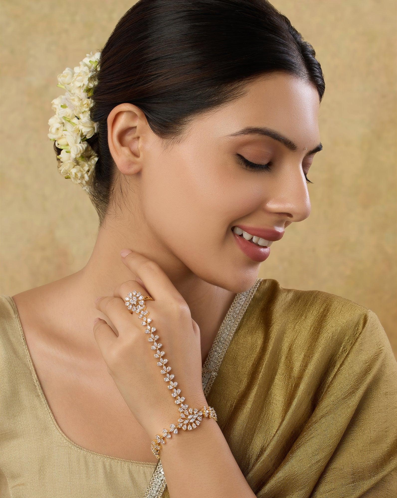 Our collection of zircon jewellery includes earrings, necklaces, bracelets, rings, and hair accessories for every Indian celebration. Our pieces also feature temple motifs, Punjabi Jadau work, Kundan work, and Polki work. In earrings, we have jhumkas, jhumkis, chaand baalis, chandelier earrings, studs, hoops and more. In necklaces, we have chokers, long necklaces, layered necklaces and more. In rings, we have stackable and statement styles. In wristwear, we have bangles, bracelets, cuffs and more. So, no matter what style you're looking for, you'll find something to love from our collection.