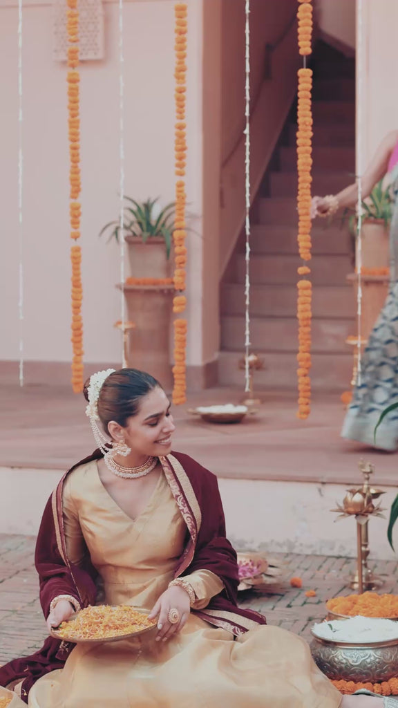 These Temple Pearl Ear Chains combine traditional elegance with contemporary sophistication. Expertly crafted in mixed metal, these statement ear chains feature pearls meticulously set to evoke the essence of ancient temple jewellery. A lustrous gold finish and delicate temple motifs pay homage to India's rich cultural heritage. Perfect for festive occasions, these ear chains will elevate your traditional outfits with their timeless charm. The classic design makes them versatile enough to pair with saris, lehengas, or Anarkali suits, ensuring you make a stunning impression at weddings, Diwali celebrations, or other special events.